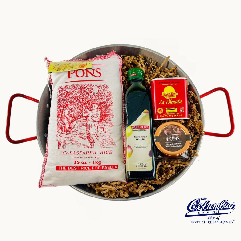 A traditional paella pan, imported from Spain and filled with authentic ingredients to prepare the national dish of Spain. La Chinata smoked paprika from La Vera, Spain, Spanish olive oil, Spanish organic saffron and Calasparra rice.